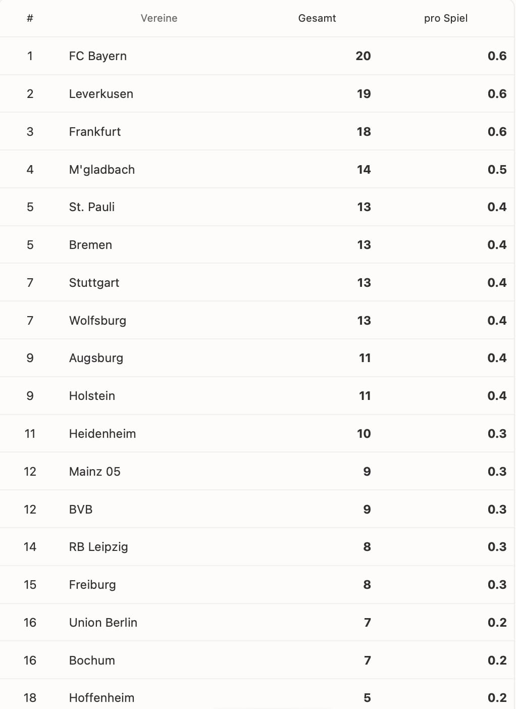 Auf Platz 7 und damit besser als in der aktuellen Gesamttabelle liegt hier der VfB. Ob gewollt oder nicht verbesserte der Verein ebenso seinen Schnitt durch zwei Aluminiumtreffer im bereits sechsten verloren gegangenen Heimspiel diese Saison. Nick Woltemade kam, sah und traf die Latte. Deniz Undav spielte endlich wieder durch, hatte eine Chance und köpfte diese an den Pfosten. Der Rest scheiterte am starken Keeper Kevin Müller aus Heidenheim. Selbst der leidgeplagte Trainer konnte das erneut verlorene Spiel nicht mehr erklären. Grundsätzlich kann man beim VfB auch keine reine Aluallergie diagnostizieren. Ein Arzt würde mehr auf eine ernsthaft grassierende Chancenwucherallergie tippen, so mein Verständnis.